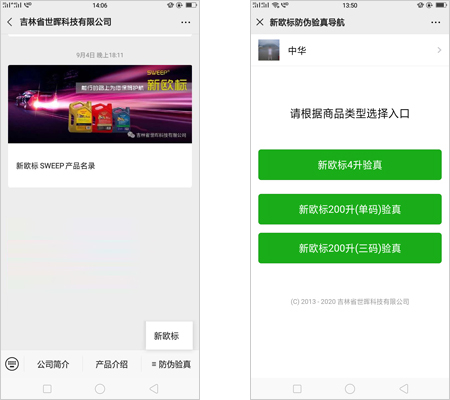 為了保障廣大車主權(quán)益,維護消費者安全。世暉科技微信公眾平臺提供SWEEP(新歐標)品牌潤滑油防偽驗真服務(wù)。驗真操作步驟如下: