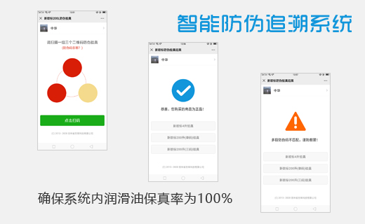 公司獨有高智能防偽系統(tǒng),通過對每一瓶潤滑油的實時跟蹤,確保系統(tǒng)內(nèi)潤滑油保真率為100%,最大限度的保證消費者的權(quán)益。